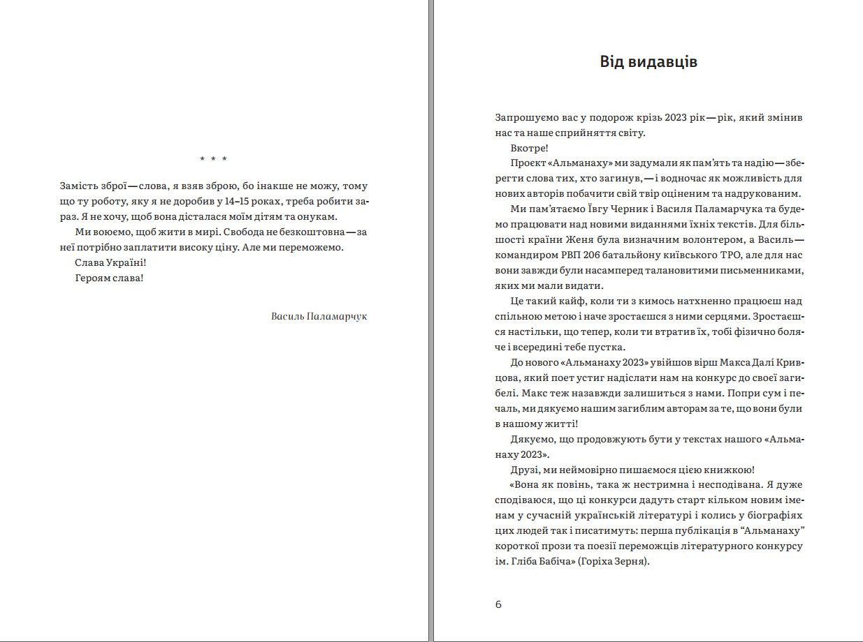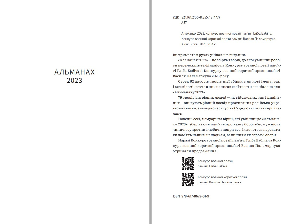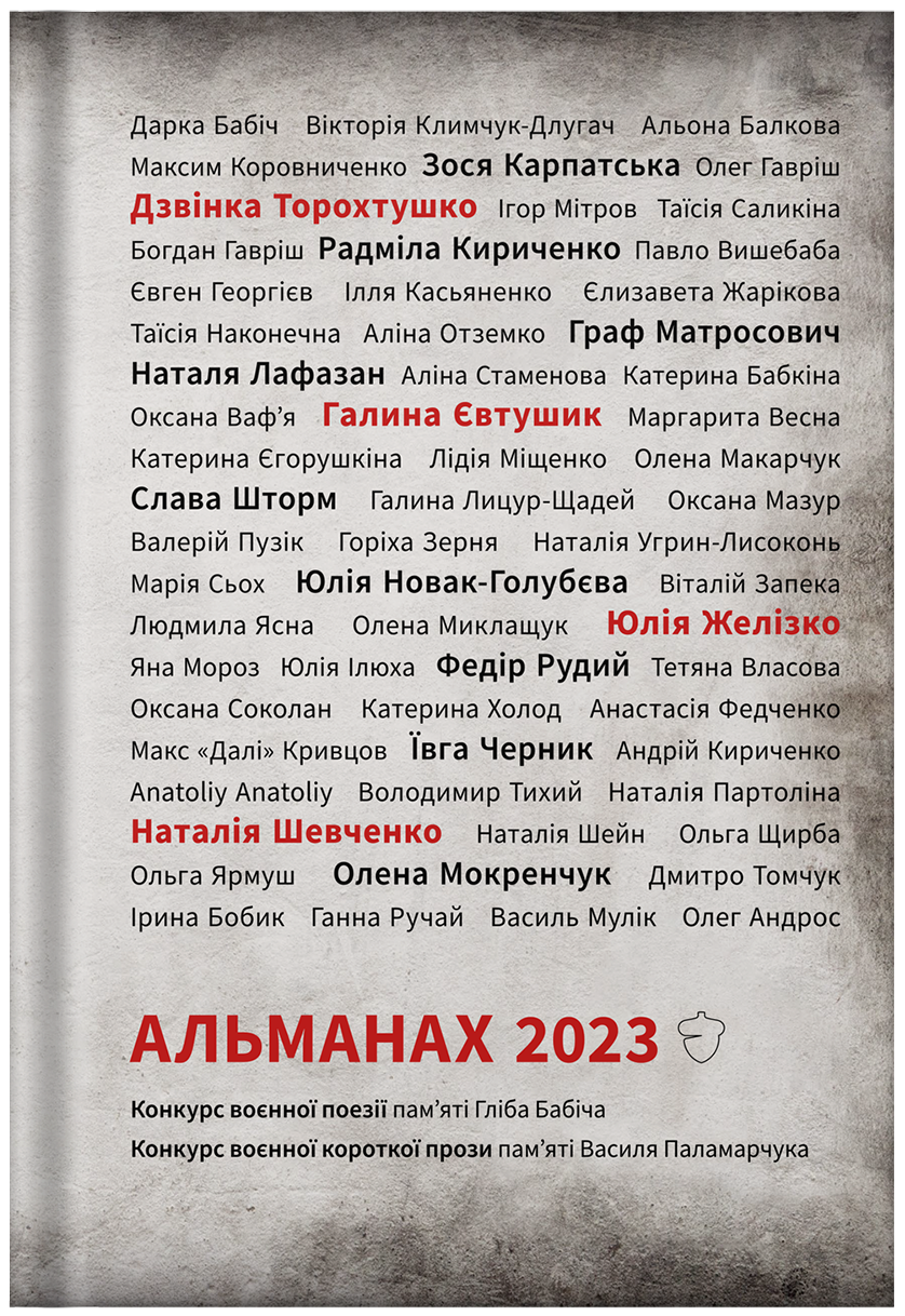 «Альманах 2023» — це збірка творів, до якої увійшли роботи переможців та фіналістів Конкурсу воєнної поезії пам’яті Гліба Бабіча й Конкурсу воєнної короткої прози пам’яті Василя Паламарчука 2023 року.