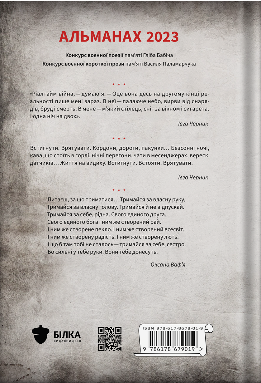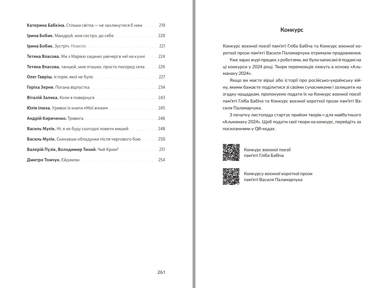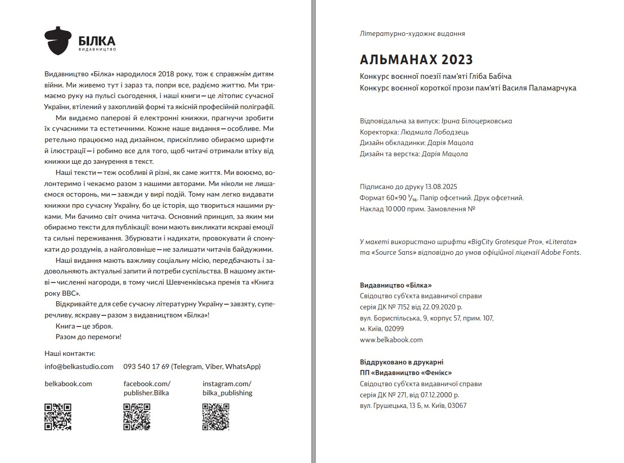 «Альманах 2023» — це збірка творів, до якої увійшли роботи переможців та фіналістів Конкурсу воєнної поезії пам’яті Гліба Бабіча й Конкурсу воєнної короткої прози пам’яті Василя Паламарчука 2023 року.