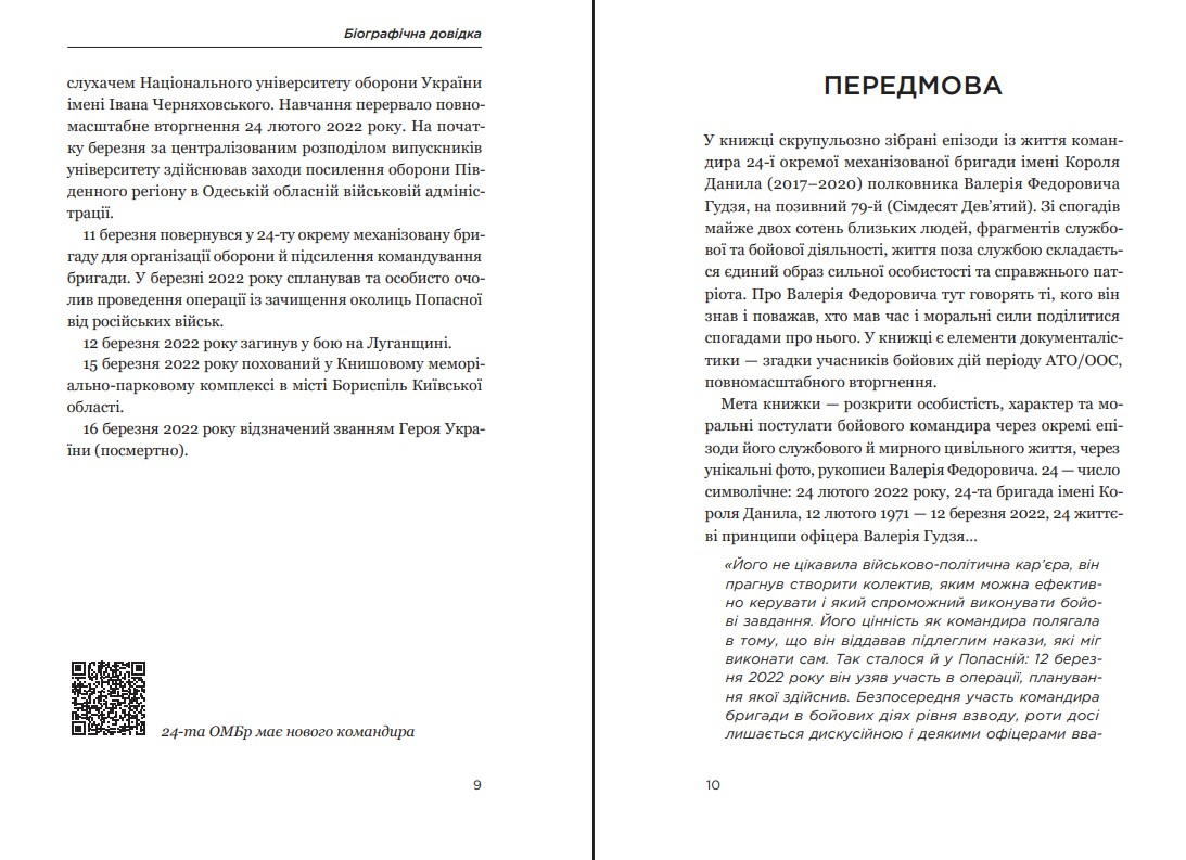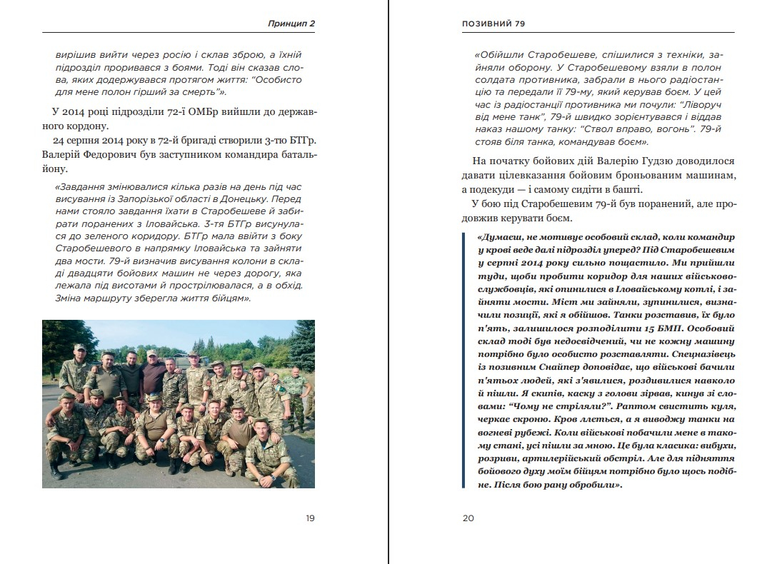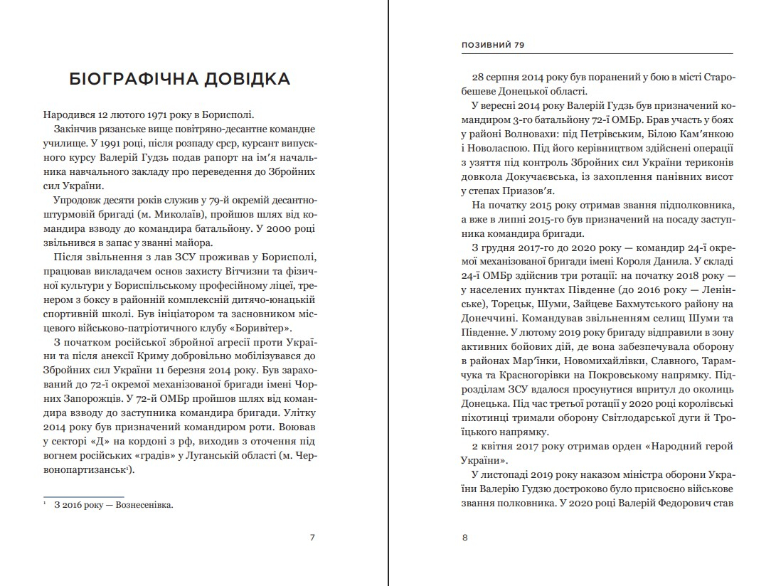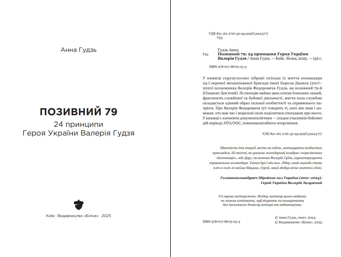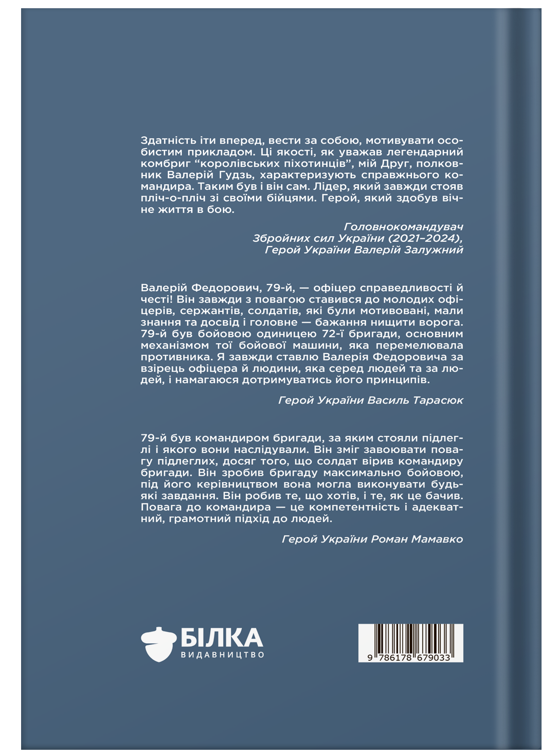 У книжці скрупульозно зібрані епізоди із життя командира 24-ї окремої механізованої бригади імені Короля Данила (2017–2020) полковника Валерія Федоровича Гудзя, на позивний 79-й (Сімдесят Дев’ятий). Зі спогадів майже двох сотень близьких людей, фрагментів службової та бойової діяльності, життя поза службою складається єдиний образ сильної особистості та справжнього патріота. Про Валерія Федоровича тут говорять ті, кого він знав і поважав, хто мав час і моральні сили поділитися спогадами про нього.
