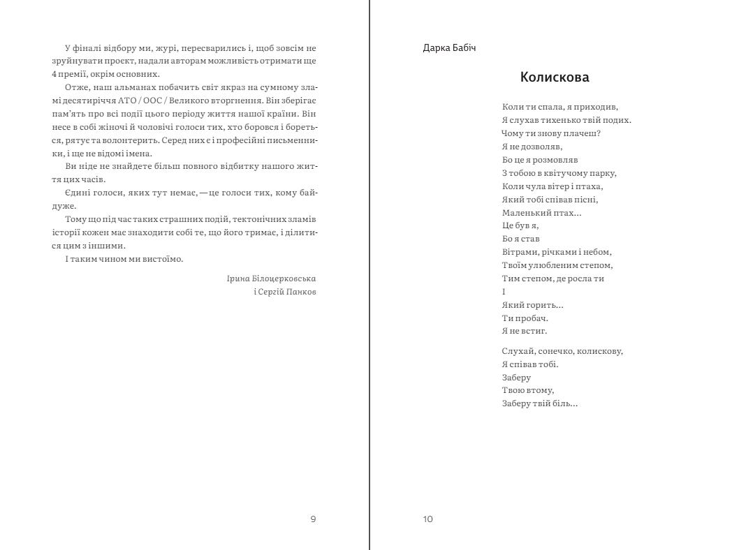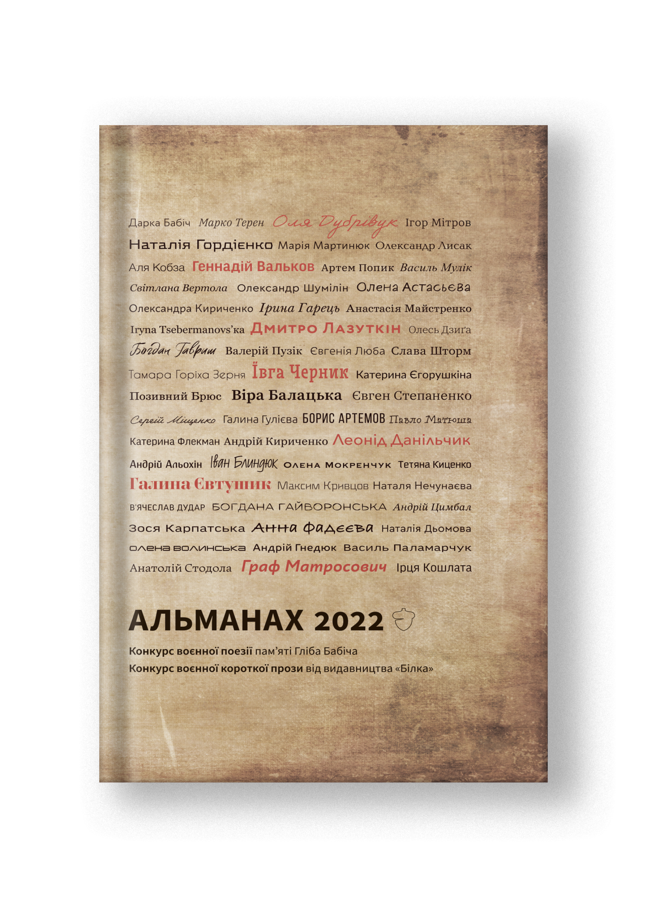 «Альманах 2022» — це збірка творів, до якої увійшли роботи переможців та фіналістів Конкурсу військової поезії пам’яті Гліба Бабіча й Конкурсу воєнної короткої прози від видавництва «Білка».