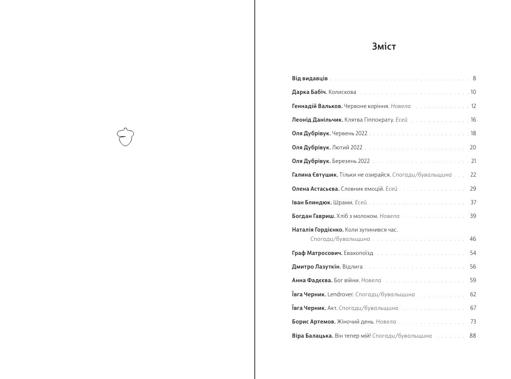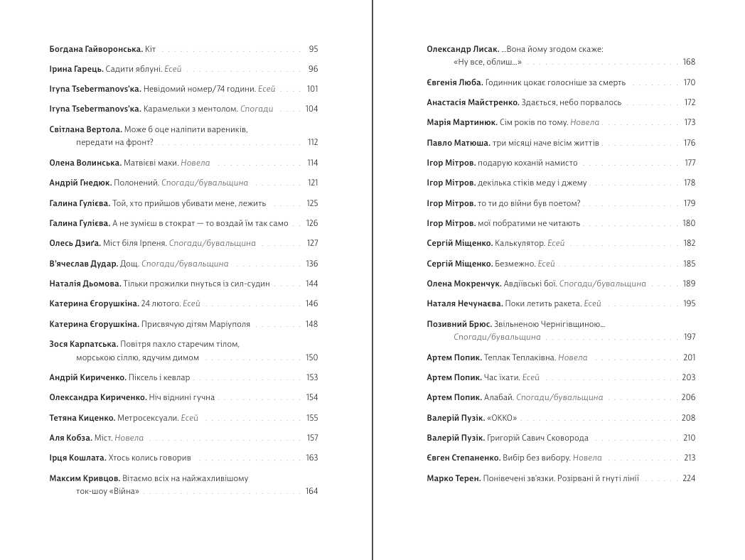 - 76 творів від абсолютно різних людей — і військових, і цивільних — об’єднані проживанням російсько-української війни у період 2014–2024 років.