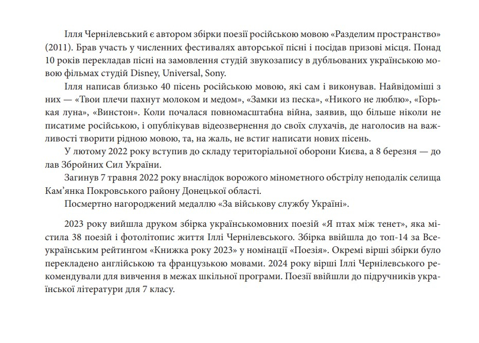 2023 року вийшла друком збірка українськомовних поезій «Я птах між тенет», яка містила 38 поезій і фотолітопис життя Іллі Чернілевського. Збірка ввійшла до топ-14 за Всеукраїнським рейтингом «Книжка року 2023» у номінації «Поезія». Окремі вірші збірки було перекладено англійською та французькою мовами. 2024 року вірші Іллі Чернілевського рекомендували для вивчення в межах шкільної програми. Поезії ввійшли до підручників української літератури для 7 класу.