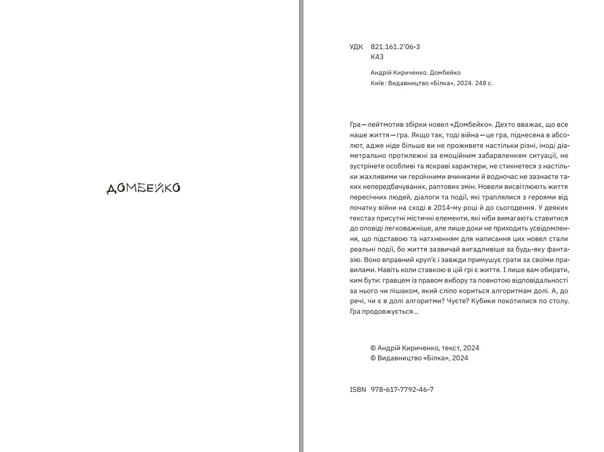 Гра — лейтмотив збірки новел «Домбейко». Дехто вважає, що все наше життя — гра. Якщо так, тоді війна — це гра, піднесена в абсолют, адже ніде більше ви не проживете настільки різні, іноді діаметрально протилежні за емоційним забарвленням ситуації, не зустрінете особливі та яскраві характери, не стикнетеся з настільки жахливими чи героїчними вчинками й водночас не зазнаєте таких непередбачуваних, раптових змін.