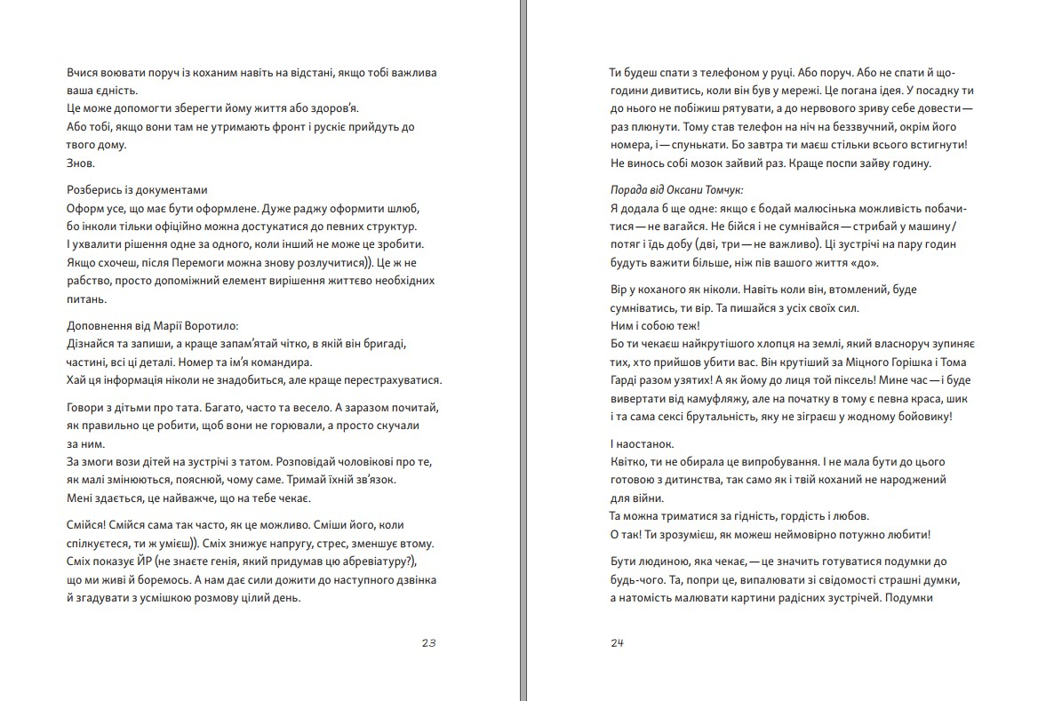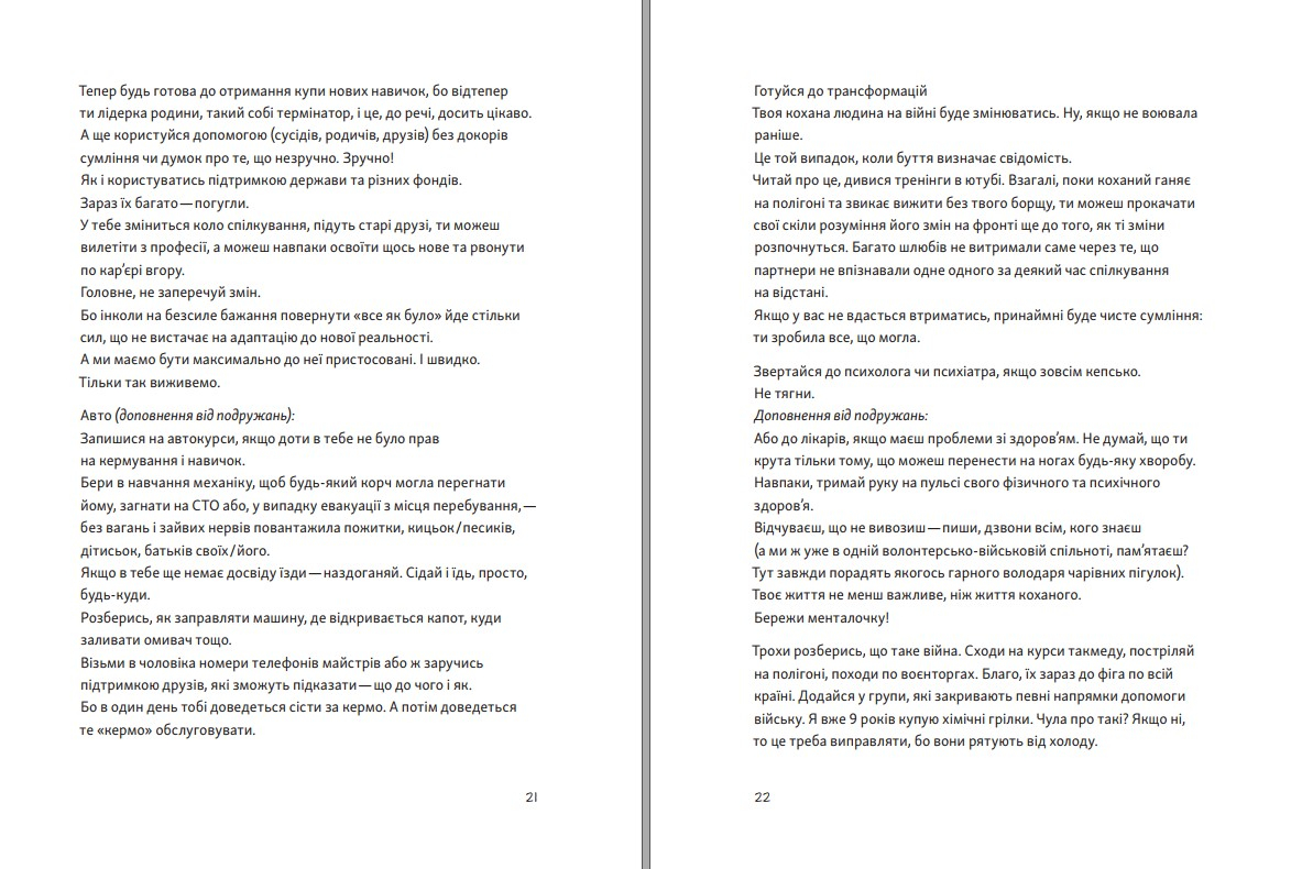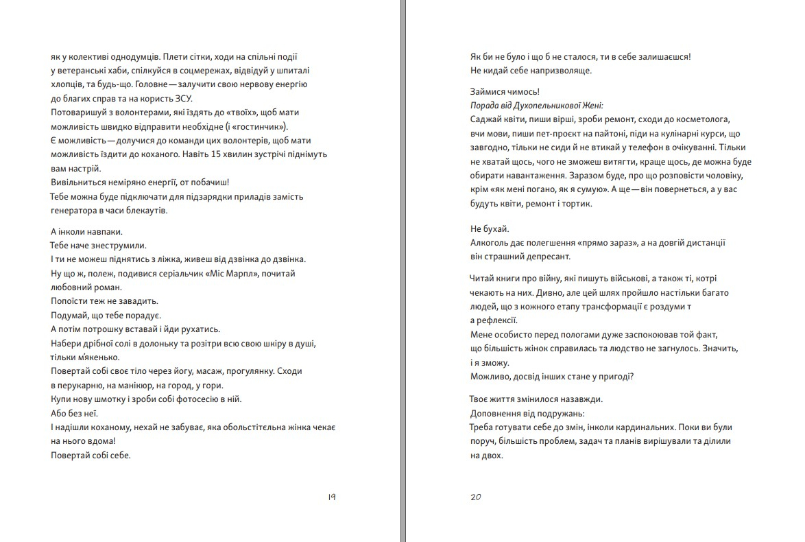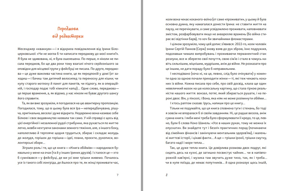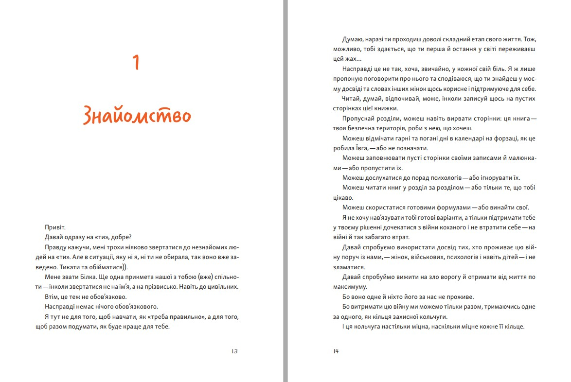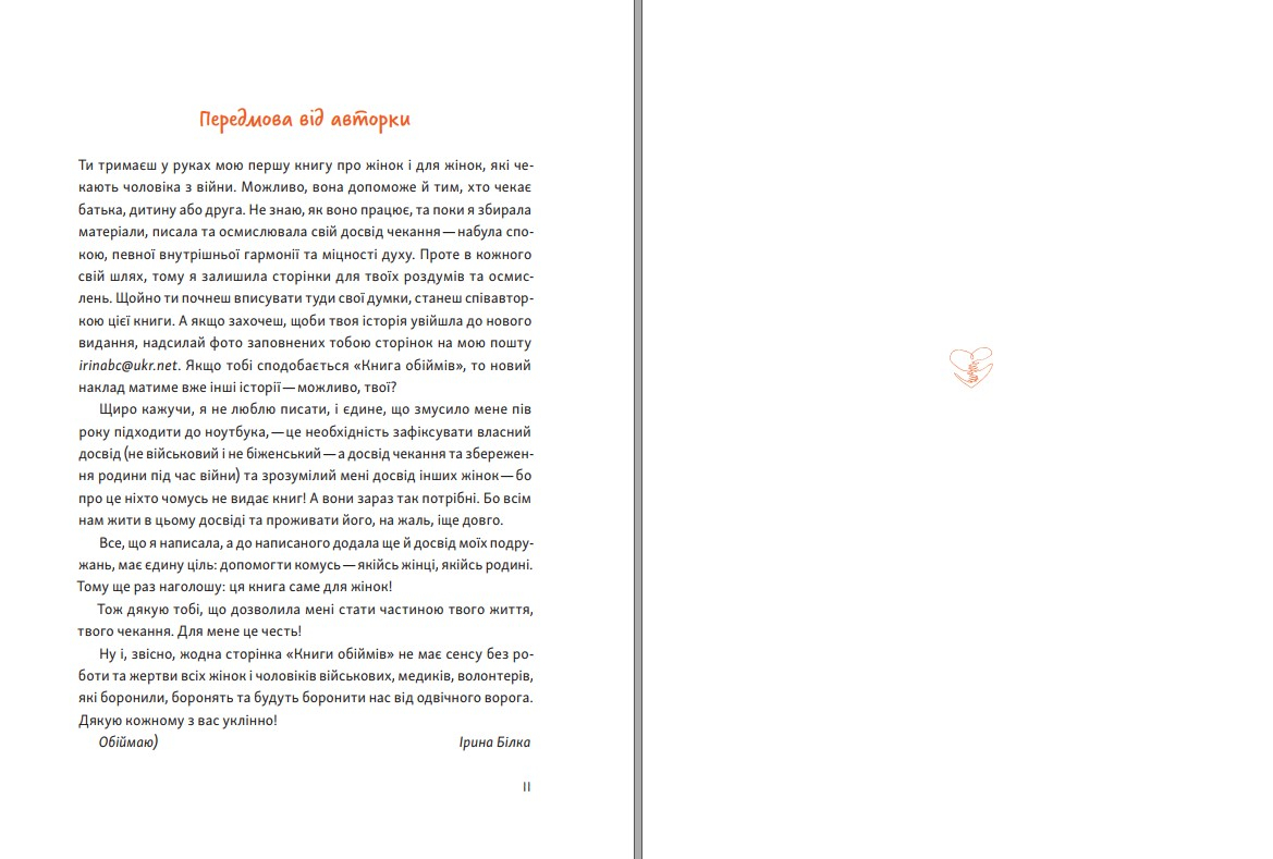 Ти тримаєш у руках мою першу книгу про жінок і для жінок, які чекають чоловіка з війни. Можливо, вона допоможе й тим, хто чекає батька, дитину або друга. Не знаю, як воно працює, та поки я збирала матеріали, писала та осмислювала свій досвід чекання — набула спокою, певної внутрішньої гармонії та міцності духу. Проте в кожного свій шлях, тому я залишила сторінки для твоїх роздумів та осмислень. Щойно ти почнеш вписувати туди свої думки, станеш співавторкою цієї книги. А якщо захочеш, щоби твоя історія увійшла до нового видання, надсилай фото заповнених тобою сторінок на мою пошту irinabc@ukr.net.