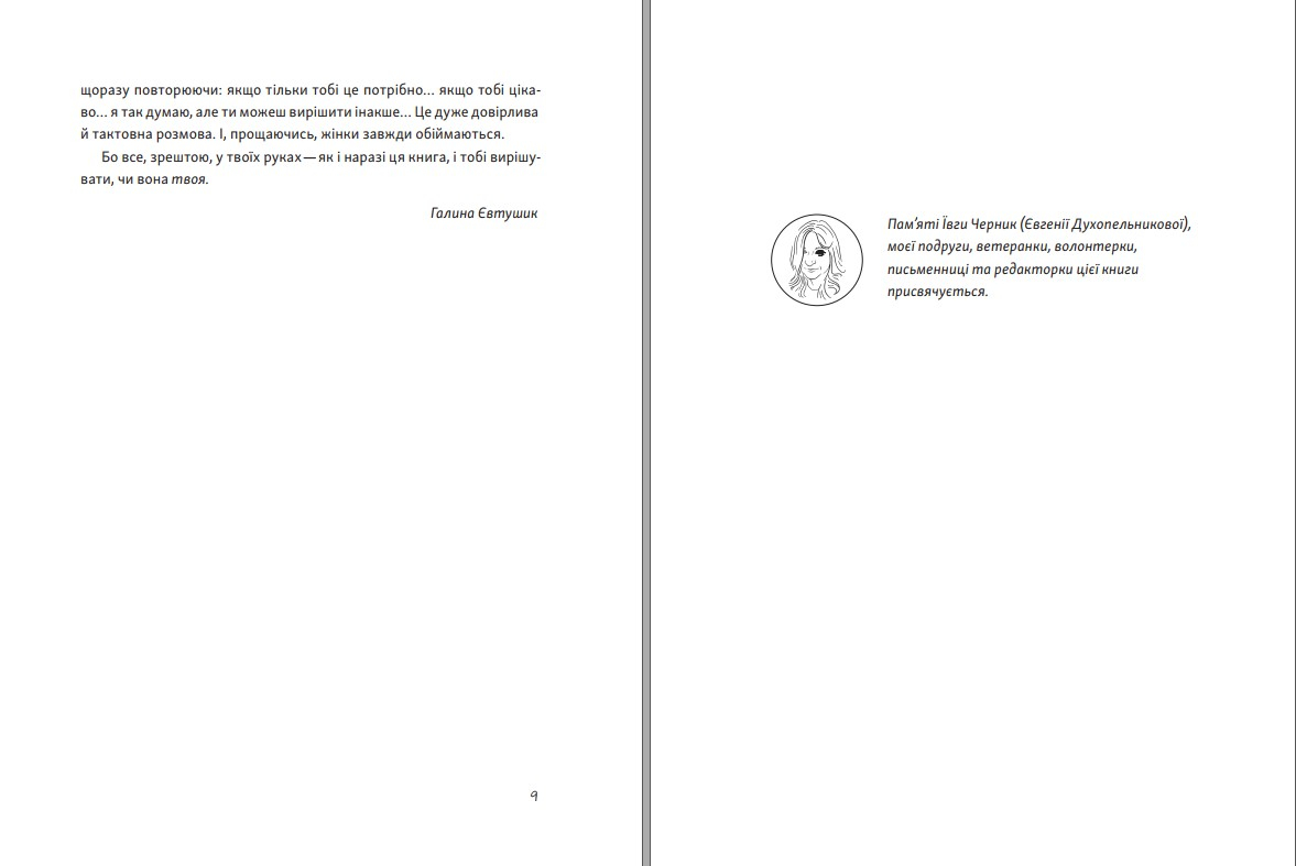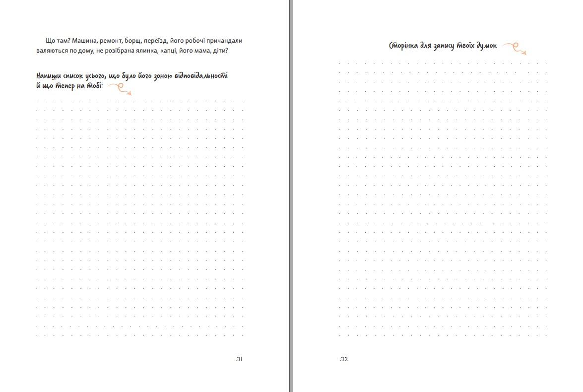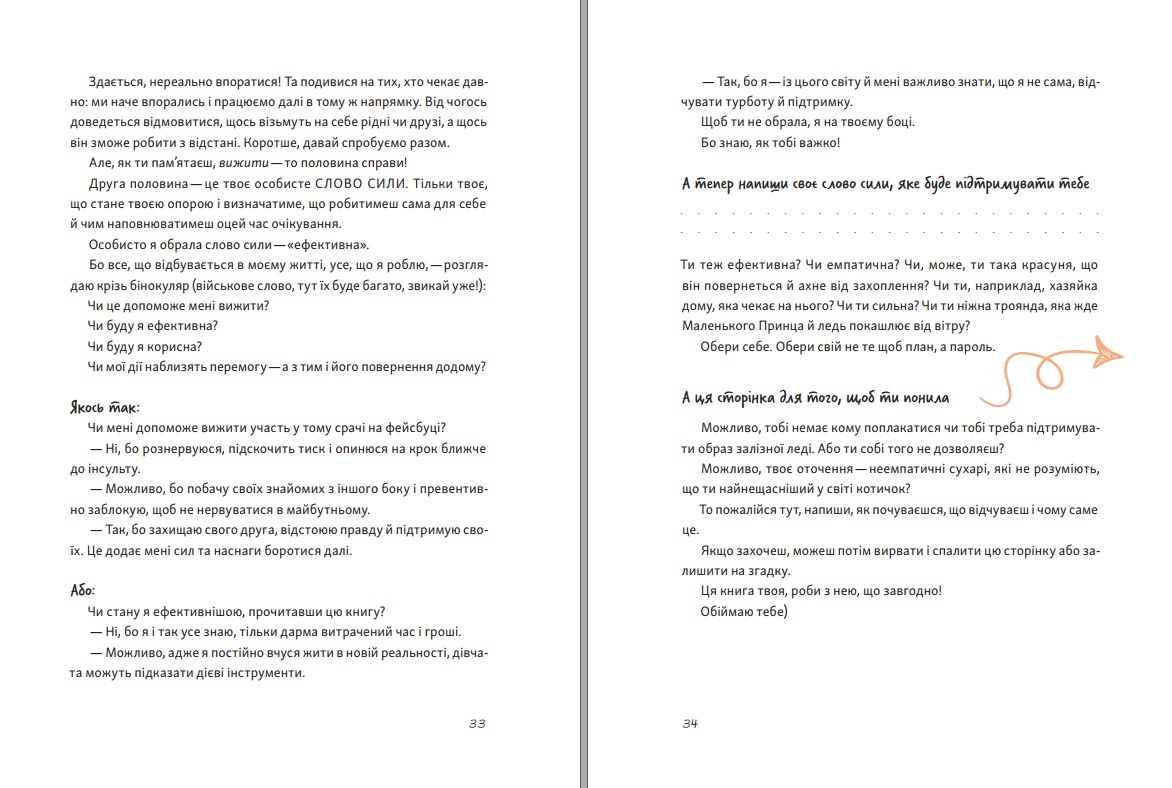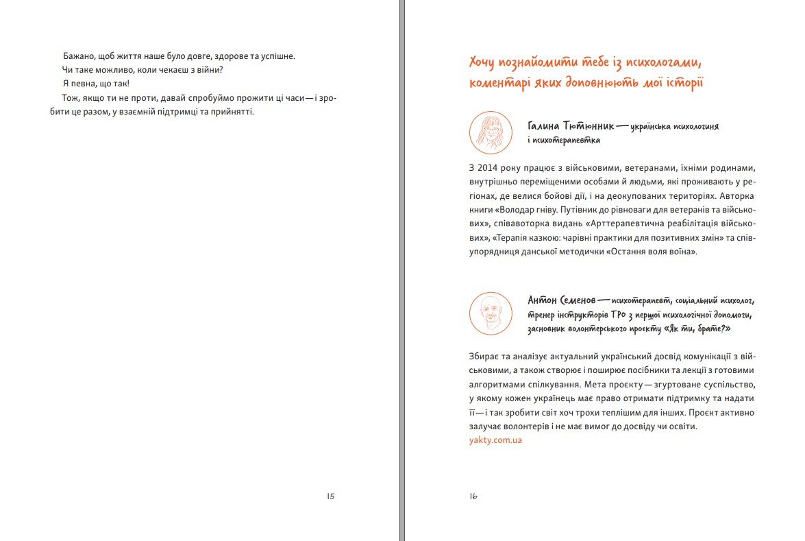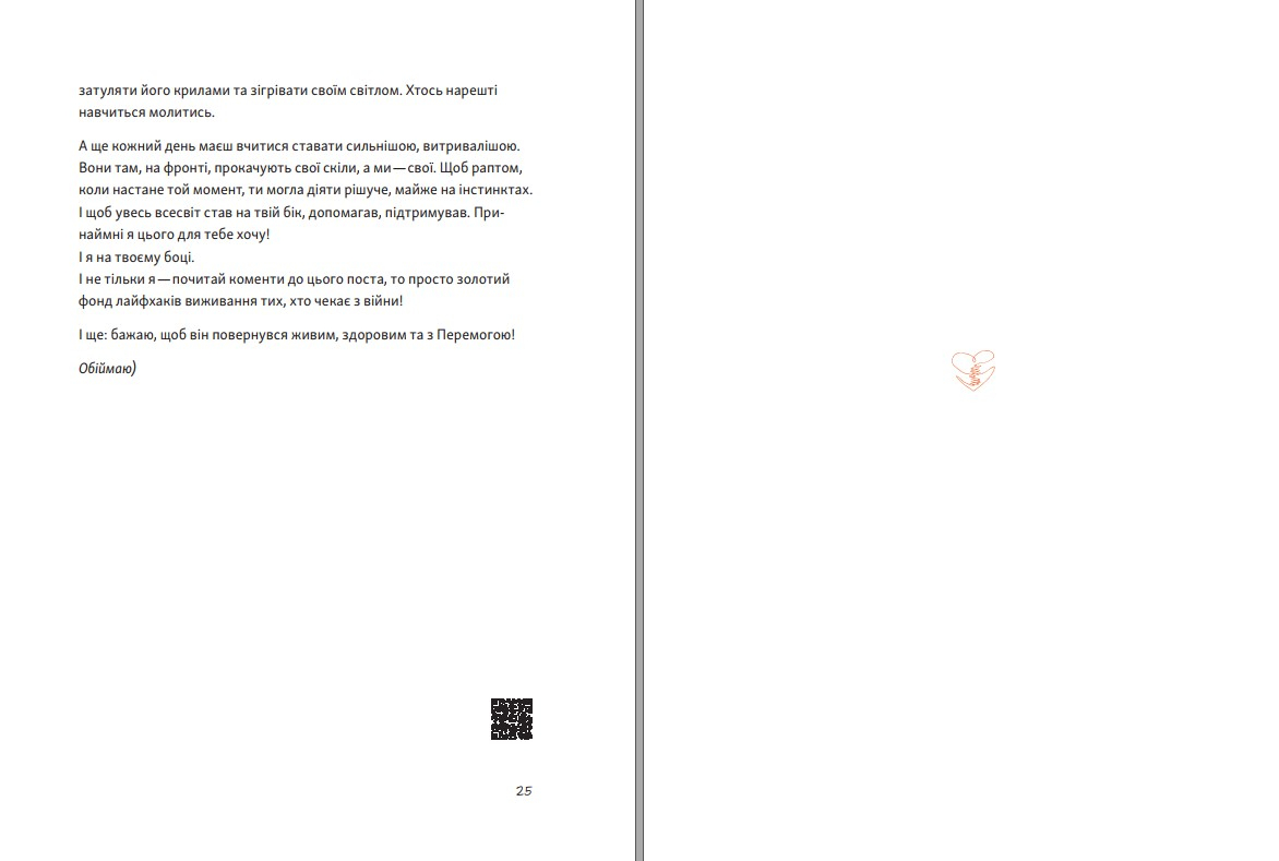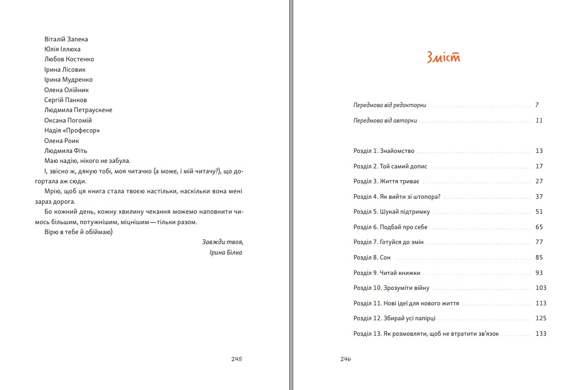 Ти тримаєш у руках мою першу книгу про жінок і для жінок, які чекають чоловіка з війни. Можливо, вона допоможе й тим, хто чекає батька, дитину або друга. Не знаю, як воно працює, та поки я збирала матеріали, писала та осмислювала свій досвід чекання — набула спокою, певної внутрішньої гармонії та міцності духу. Проте в кожного свій шлях, тому я залишила сторінки для твоїх роздумів та осмислень. Щойно ти почнеш вписувати туди свої думки, станеш співавторкою цієї книги. А якщо захочеш, щоби твоя історія увійшла до нового видання, надсилай фото заповнених тобою сторінок на мою пошту irinabc@ukr.net.