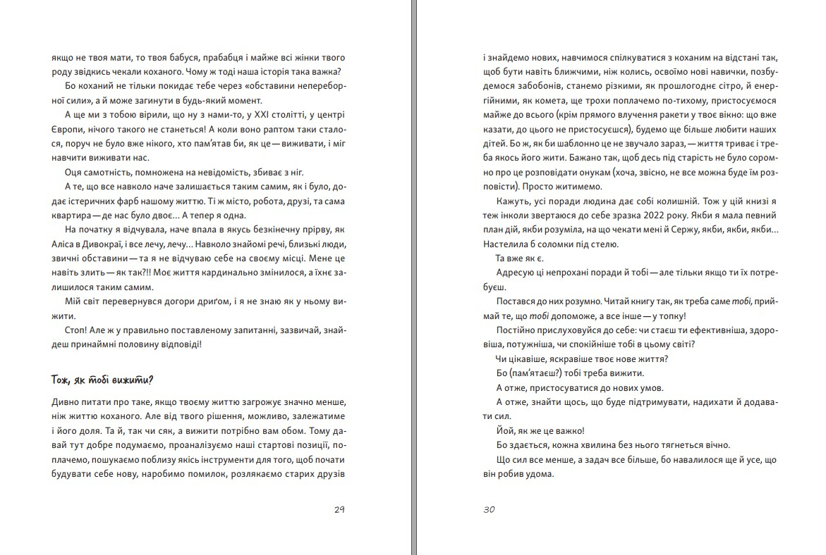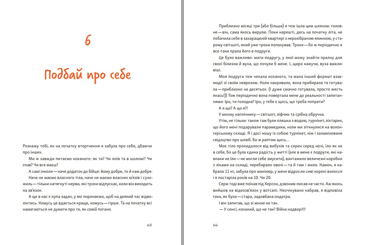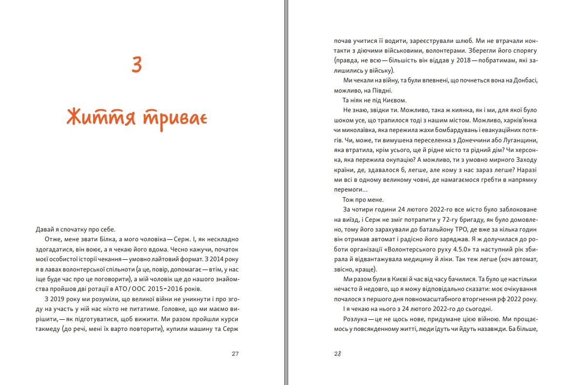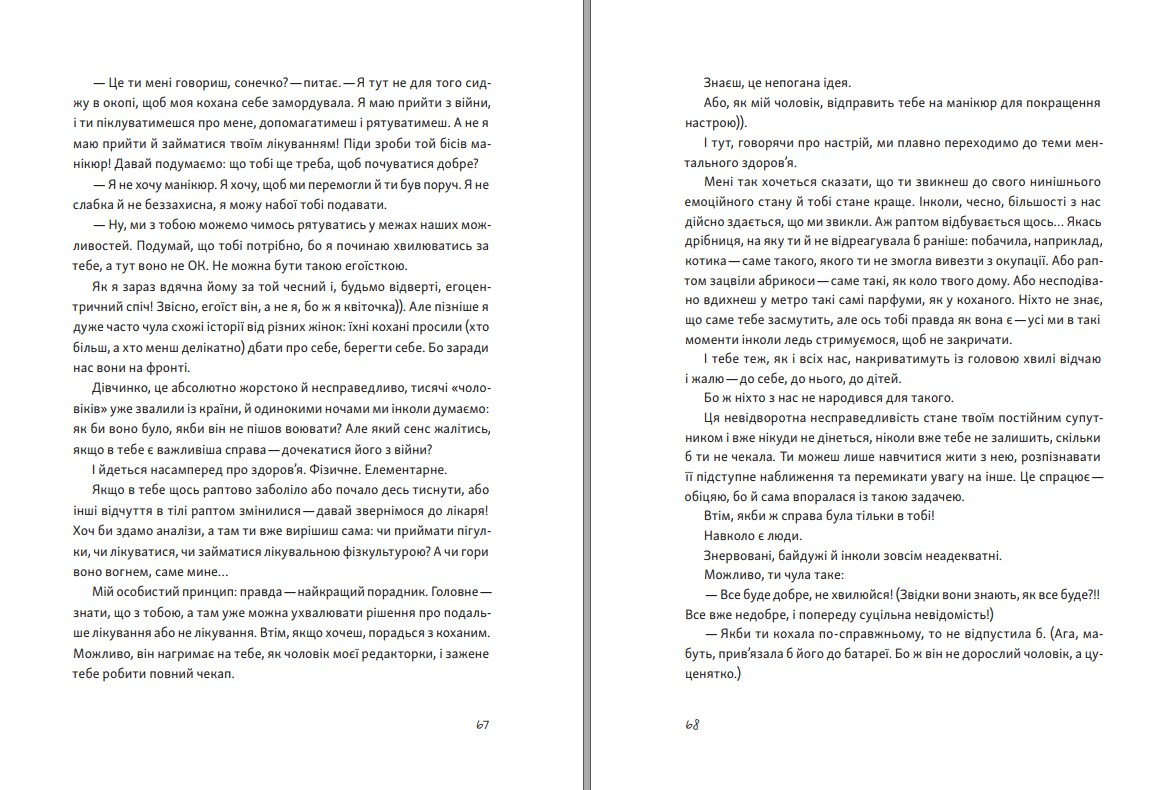 Щиро кажучи, я не люблю писати, і єдине, що змусило мене пів року підходити до ноутбука, — це необхідність зафіксувати власний досвід (не військовий і не біженський — а досвід чекання та збереження родини під час війни) та зрозумілий мені досвід інших жінок — бо про це ніхто чомусь не видає книг! А вони зараз так потрібні. Бо всім нам жити в цьому досвіді та проживати його, на жаль, іще довго.