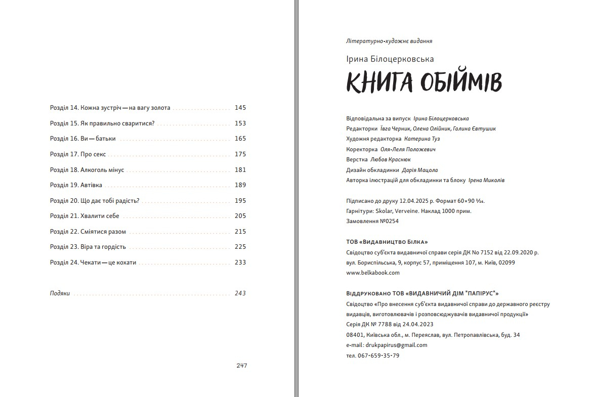 Цю книгу написала жінка, яка на вашому боці та в одному з вами човні. «Книга обіймів» — рука подруги, добрі обійми, сказані в потрібний момент слова. Написана з любов’ю, гумором, великою повагою і ніжністю. Вона може стати тим рятувальним кругом, за яке ми чіпляємося в моменти зневіри.