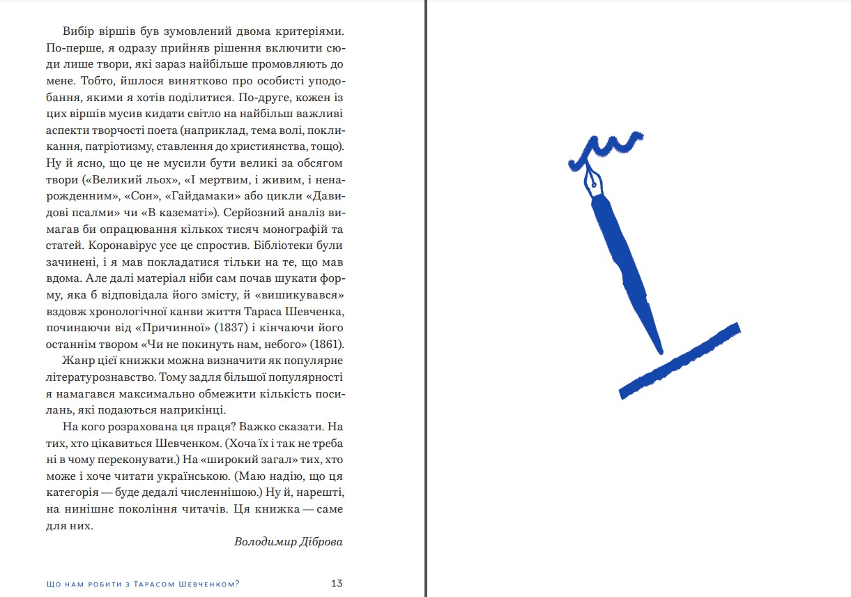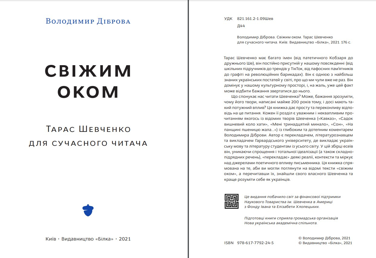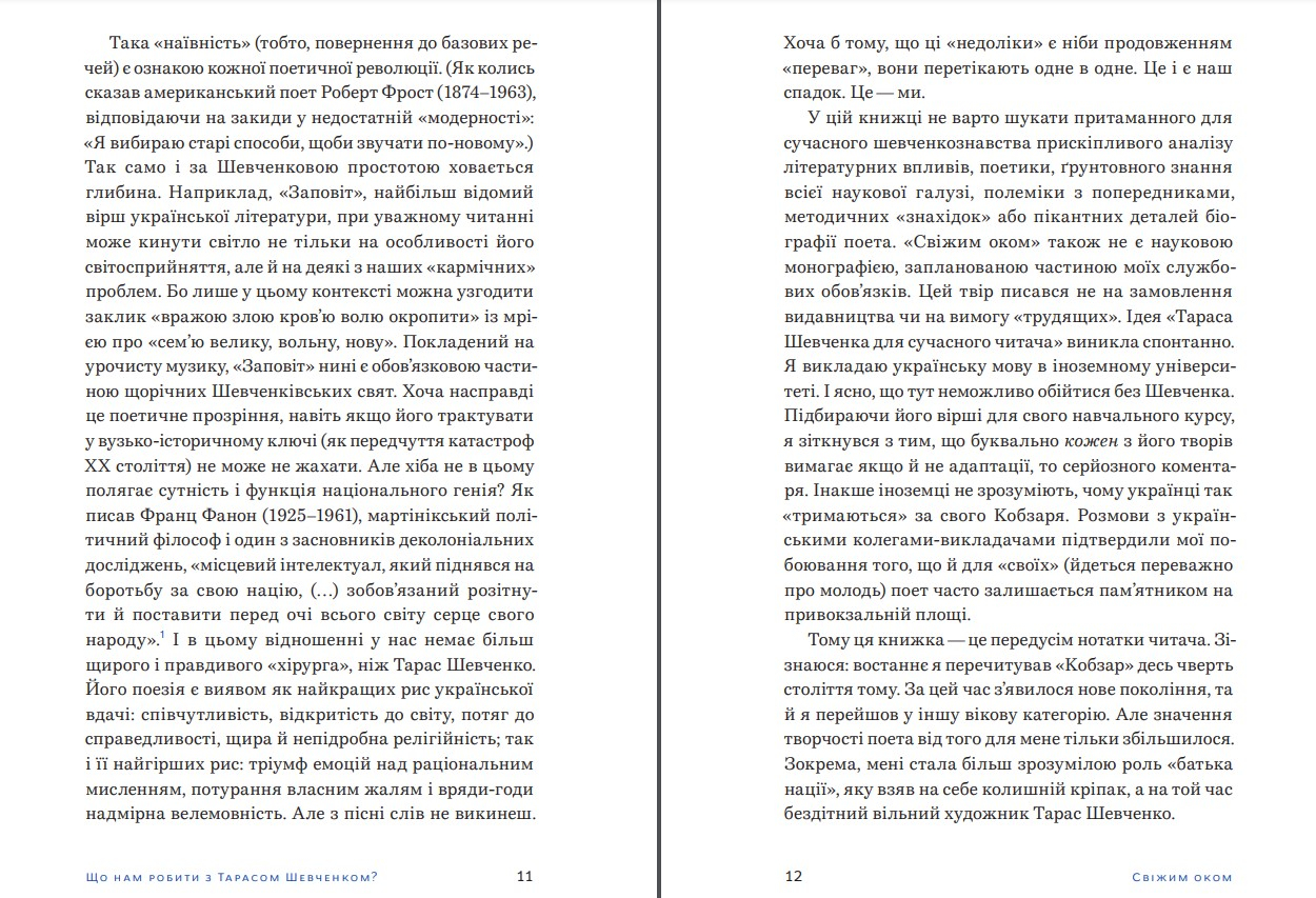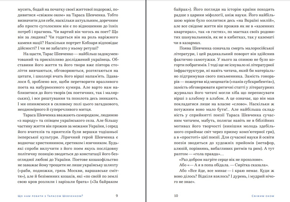 Автор є перекладачем, літературознавцем та викладачем Гарвардського університету, й викладає українську мову та літературу студентам із усього світу. В цій збірці есеїв він, уникаючи спрощення і тотальної ідеалізації, «перекладає» деякі реалії, контексти та міркує над джерелами поетичного впливу письменника. Ця книжка спрямована на те, аби ви могли поглянути на відомі тексти «свіжим оком», а перечитавши їх, знайшли свого власного Шевченка та краще розуміти себе як українців. Просто про складне та важливе. Цікаво, захопливо та динамічно про літературні тексти й їхні впливи на культуру, суспільство.