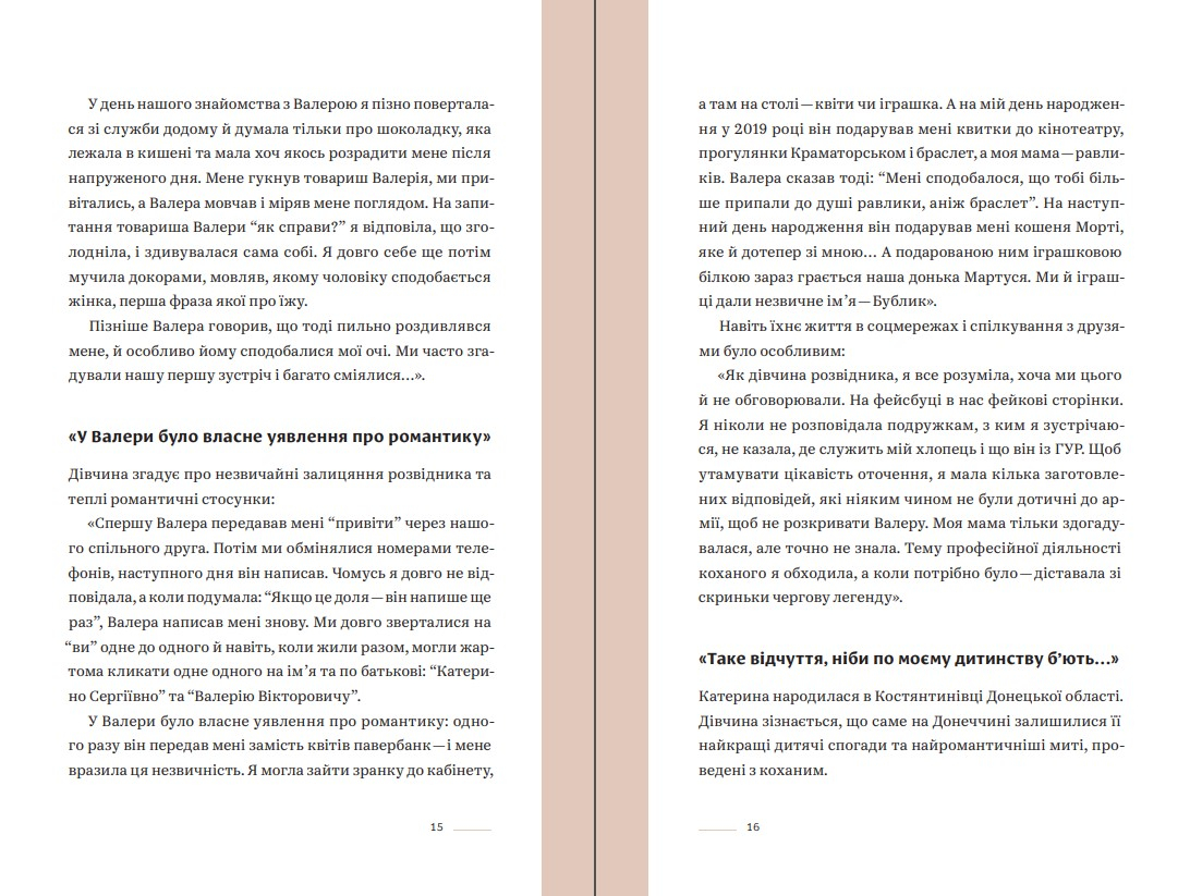 Герої України у цій книзі люблячі, ніжні, а їхні наречені, дружини, сестра – вірні, турботливі, ті, які завжди все розуміли. Історії відкривають завісу і показують чоловіків-воїнів вдома, розповідають моменти найбільшого щастя жінок. Вони розповідають про знайомство з коханими, сімейний затишок, захоплення, побут і торкаються життя «після». Історії щастя і болю, віри й понівечення, пам’яті й натхнення.