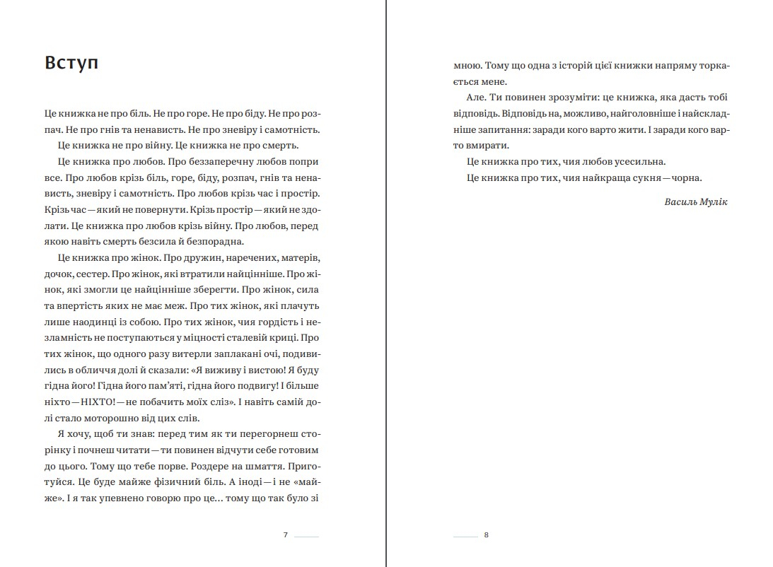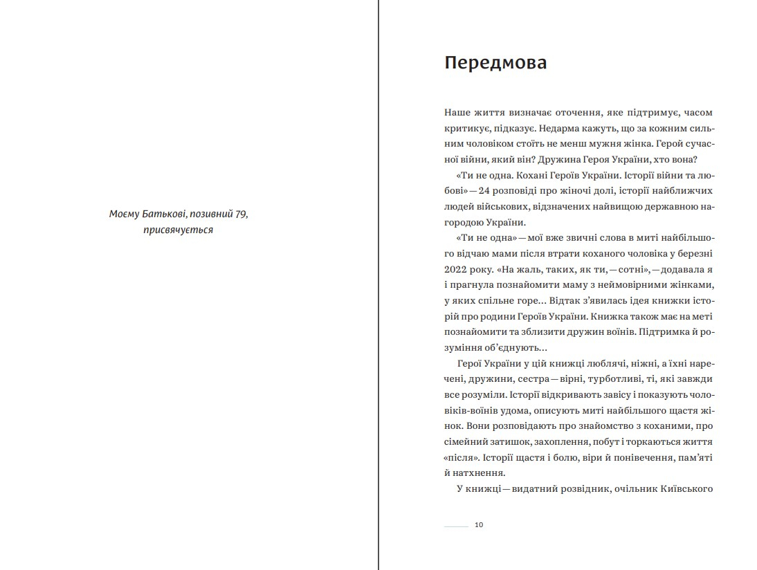 «Ти не одна» - мої вже звичні слова у моменти найбільшого відчаю мами після втрати коханого чоловіка у березні 2022 року. «На жаль, таких, як ти – сотні», - додавала я і прагнула познайомити маму з неймовірними жінками, у яких спільне горе… Відтак з`явилась ідея наповнення книги історіями про родини Героїв України. Книга також має на меті познайомити та зблизити дружин воїнів. Підтримка та розуміння об'єднують…