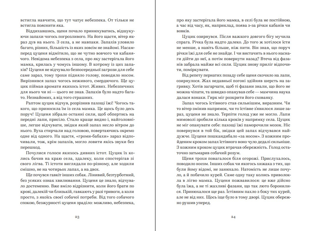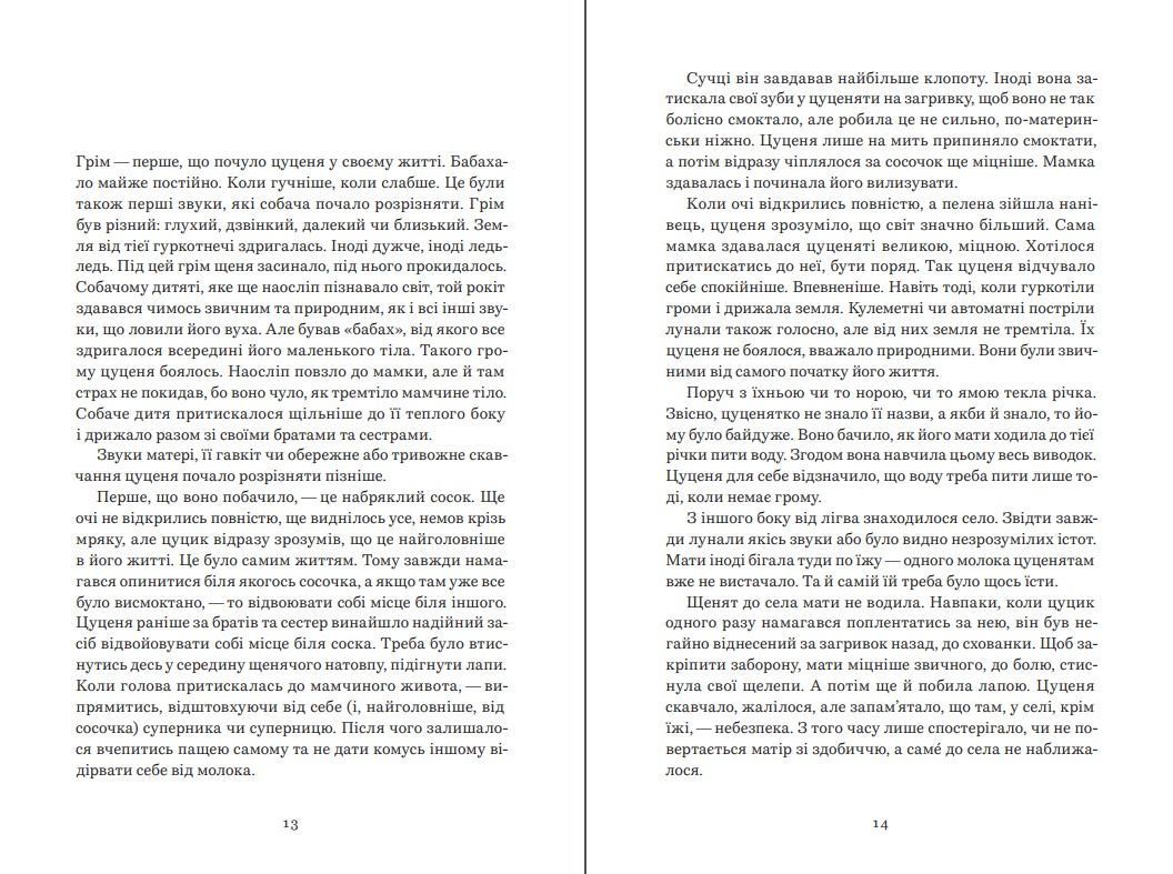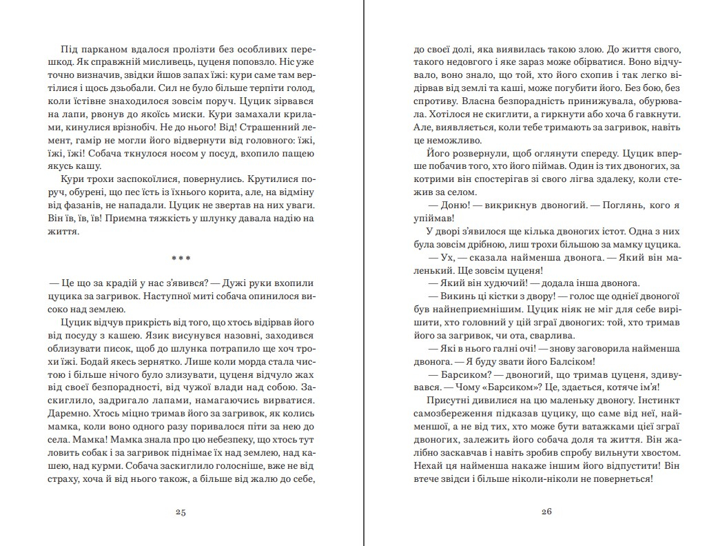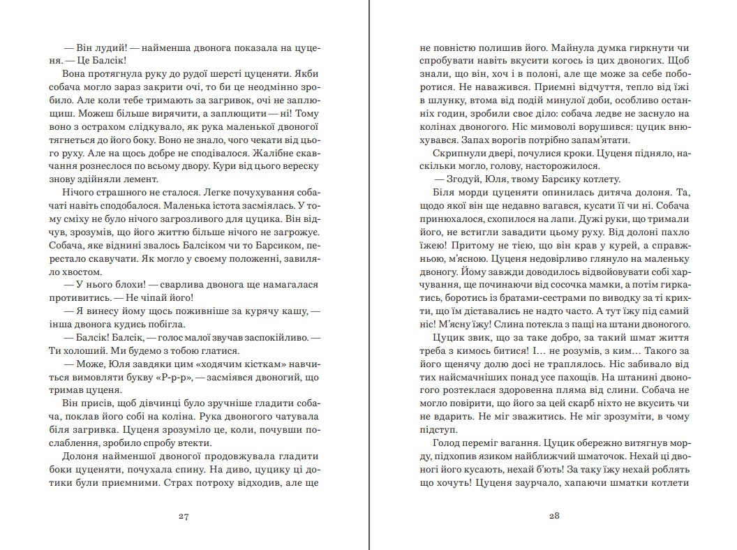 Оповідь ведеться від імені малого цуценяти. Це погляд на нас, людей, ніби збоку. Чесний і відвертий.