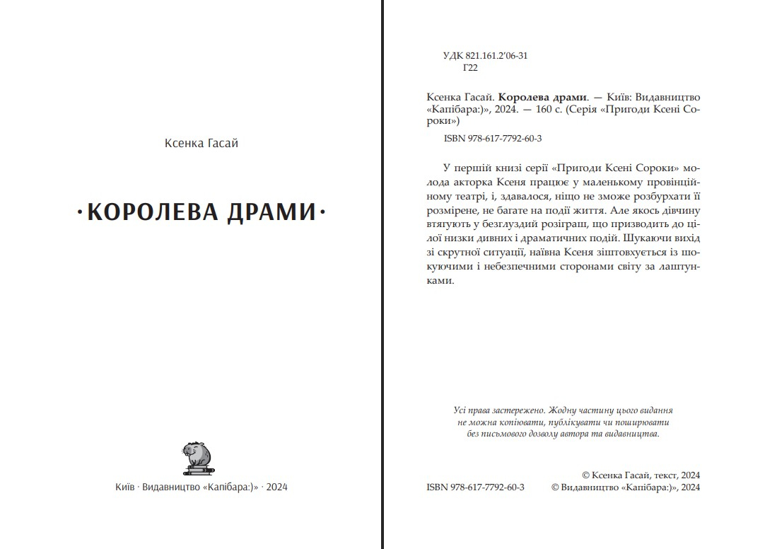Хто така Ксенка Гасай, спитаєте? Це псевдонім, де за іменем ховається жіноча, а за прізвищем — чоловіча частини нашого письменницького тандему — двоє не схожих один на одного людей. Перша — акторка, що переміряла на себе добру сотню образів і тепер не знає, як з них вийти; спочатку робить, а потім думає. Другий — фізик, кандидат наук, учасник КВК і ще бозна-хто, ерудований і ризиковий; його коріння тягнеться від самого козака Гасая.