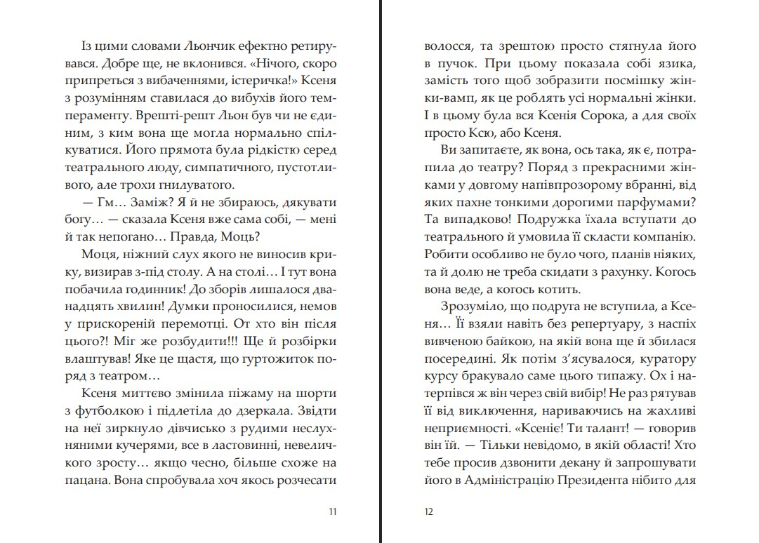 У першій книзі серії «Пригоди Ксені Сороки» молода акторка Ксеня працює у маленькому провінційному театрі, і, здавалося, ніщо не зможе розбурхати її розмірене, не багате на події життя. Але якось дівчину втягують у безглуздий розіграш, що призводить до цілої низки дивних і драматичних подій. Шукаючи вихід зі скрутної ситуації, наївна Ксеня зіштовхується із шокуючими і небезпечними сторонами світу за лаштунками.
