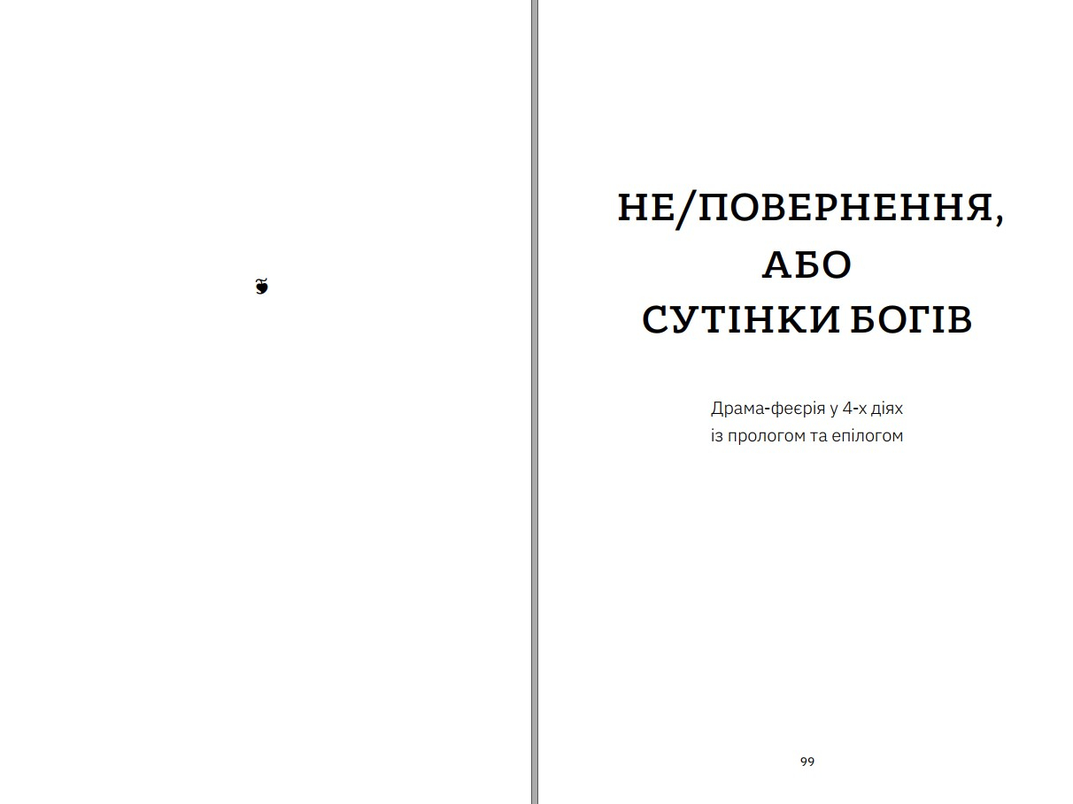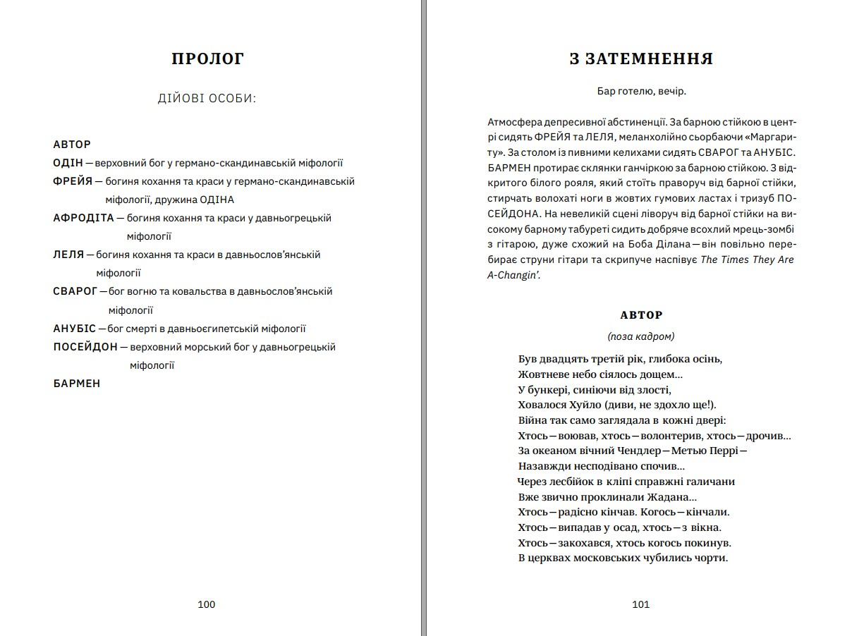 Збірка складається з чотирьох розділів. Три блоки поезій: «Любов», «Війна» та «Суб’єктивна реальність». Четвертий розділ збірки — це фантасмагорична, але водночас соціально-реалістична п’єса про прадавніх забутих богів та їхні (й не тільки їхні) пригоди у нашій з вами реальності.