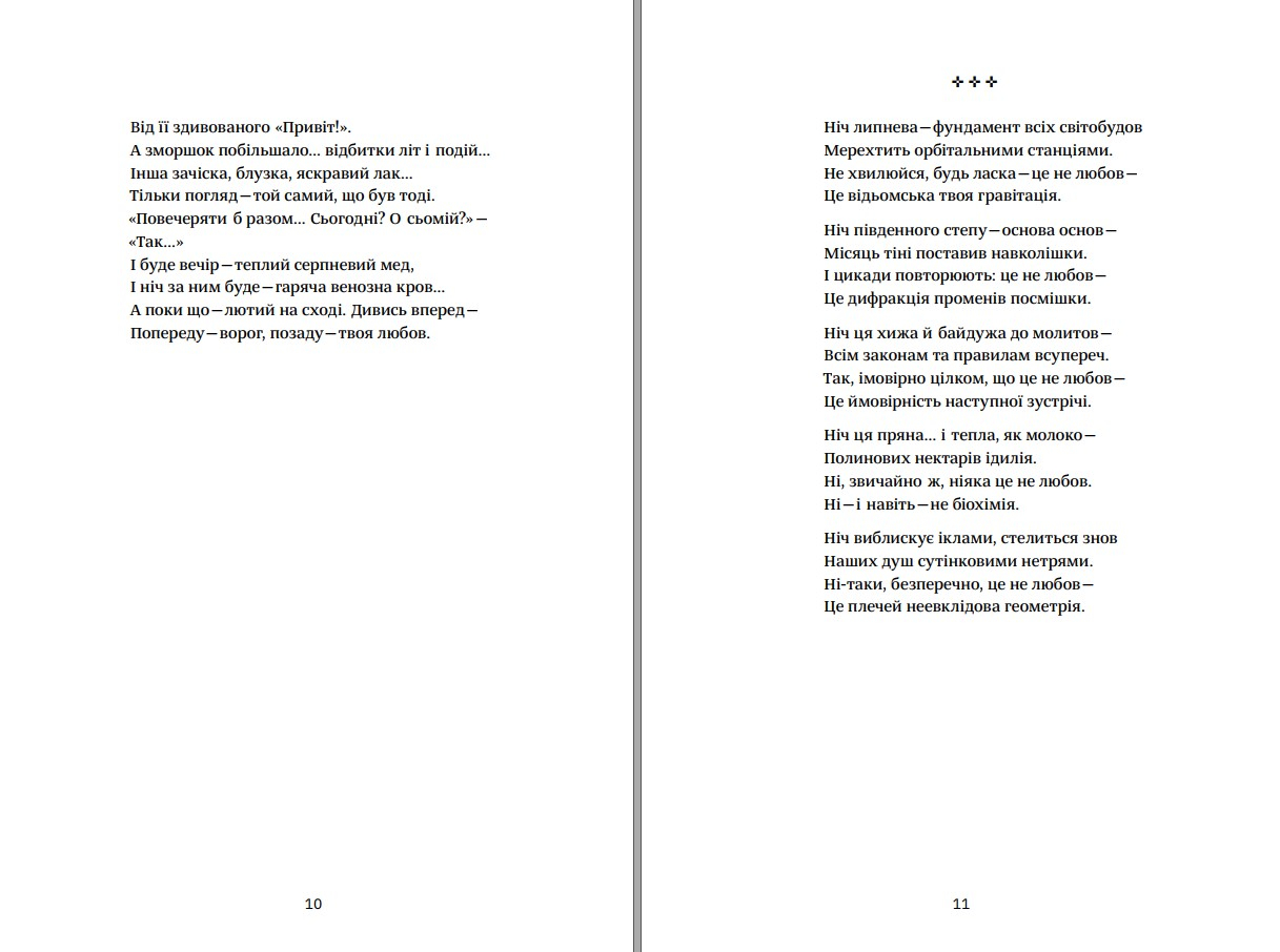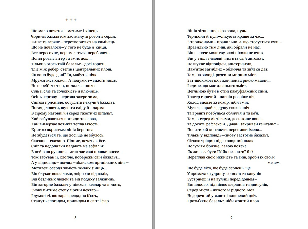 Однак поділ на розділи досить умовний. Адже теми любові, війни та реальності тісно сплетені у тугий, вібруючий джгут почуттів та відчуттів, образів та сенсів, алегорій та алюзій, метафор, тригерів та больових точок…