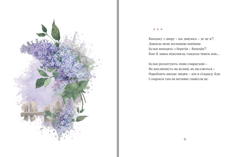 У цій книзі поезія розквітає, розливаючи пахощі. Авторка запевняє: «то все весна – весна-ворожка ворожить»… Бузкові та рожеві вірші Оксани Бевзюк – це ніжні квіти з весняним настроєм, які разом із чуттєвими акварелями Анастасії Мельникової творять чарівний сад, у якому хочеться жити! Тож, гортаючи цю книгу, будьте готові до весняного шалу, раптового щастя, зливи почуттів. А все тому, що в цій книзі весна постає у свою найпишнішу пору – у час цвітіння бузків та півоній, коли природа буяє, чарує, закохує…